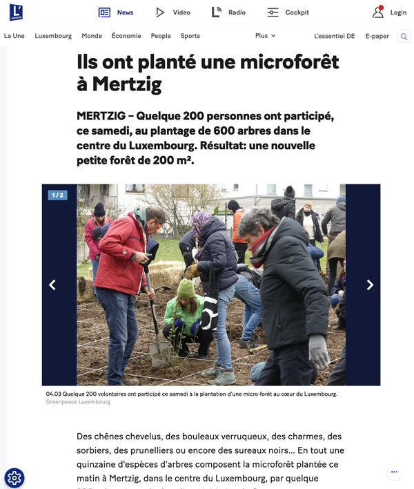 La commune de Mertzig, de son côté, a doublé la surface mise à disposition, pour la porter à 200 m². De quoi planter 600 arbres en tout, trois par mètre carré, sur un sol travaillé en amont pour «donner vie à des forêts naturelles, s’épanouissant sans intervention humaine», écrit Greenpeace dans un communiqué, évoquant un «îlot de biodiversité». […]