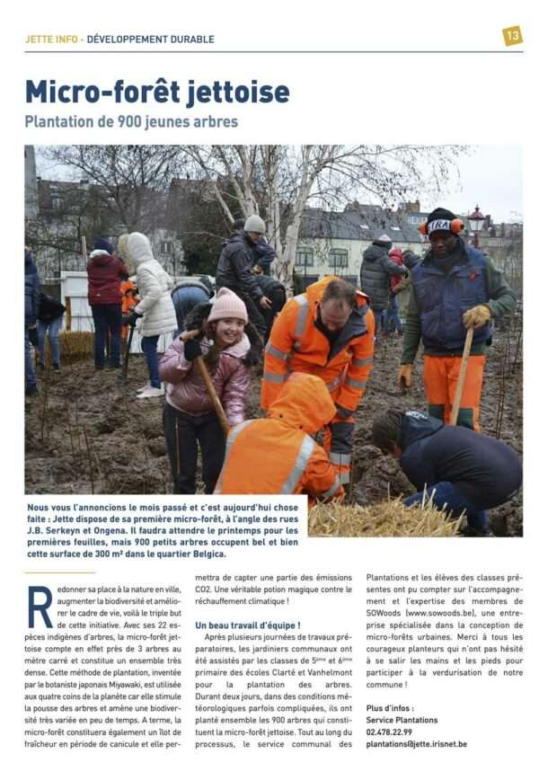 Après plusieurs journées de travaux pré-paratoires, les jardiniers communaux ont été assistés par les classes de 5ème et 6ème primaire des écoles Clarté et Vanhelmont pour la plantation des arbres. Durant deux jours, dans des conditions mé-téorologiques parfois compliquées, ils ont planté ensemble les 900 arbres qui consti-tuent la micro-forêt jettoise. Tout au long du processus, le service communal des Plantations et les élèves des classes pré-sentes ont pu compter sur l’accompagne-ment et l’expertise des membres de SOWoods (www.sowoods.be), une entre-prise spécialisée dans la conception de micro-forêts urbaines. Merci à tous les courageux planteurs qui n’ont pas hésité à se salir les mains et les pieds pour participer à la verdurisation de notre commune !